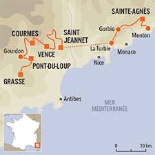 4. Courmes – Plateau de St. Barnabé – Vence (14 km, 5u, 380m klimmen) Op het plateau van Saint Barnabé heeft u fantastische uitzichten op de Alpen en de Middellandse zee. In Vence woonden en werkten o.m. Matisse en Dufy. Het stadje heeft een middeleeuws centrum, de Vielle Ville. Het stadje ligt temidden van velden met rozen,anjers, viooltjes en mimosa.